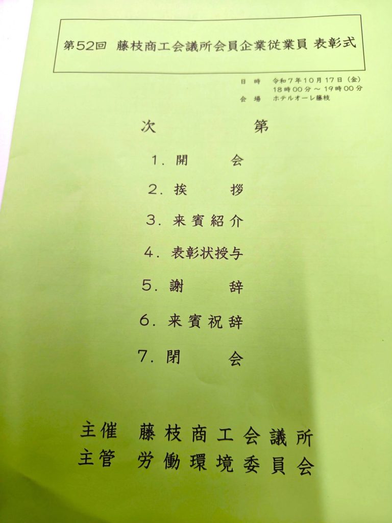 令和7年10月17日(金)、藤枝駅前のホテルオーレにて、令和7年度藤枝商工会議所会員企業従業員表彰式が執り行われました。今年も当社から二名の方を生産性向上の部門にて推薦させていただき、昨日表彰を頂きました。お二人とも勤続15年目のパートタイマーの従業員さんですが、日頃から本当に作業効率の向上に取り組んで頂いている方々で、心から感謝しています。