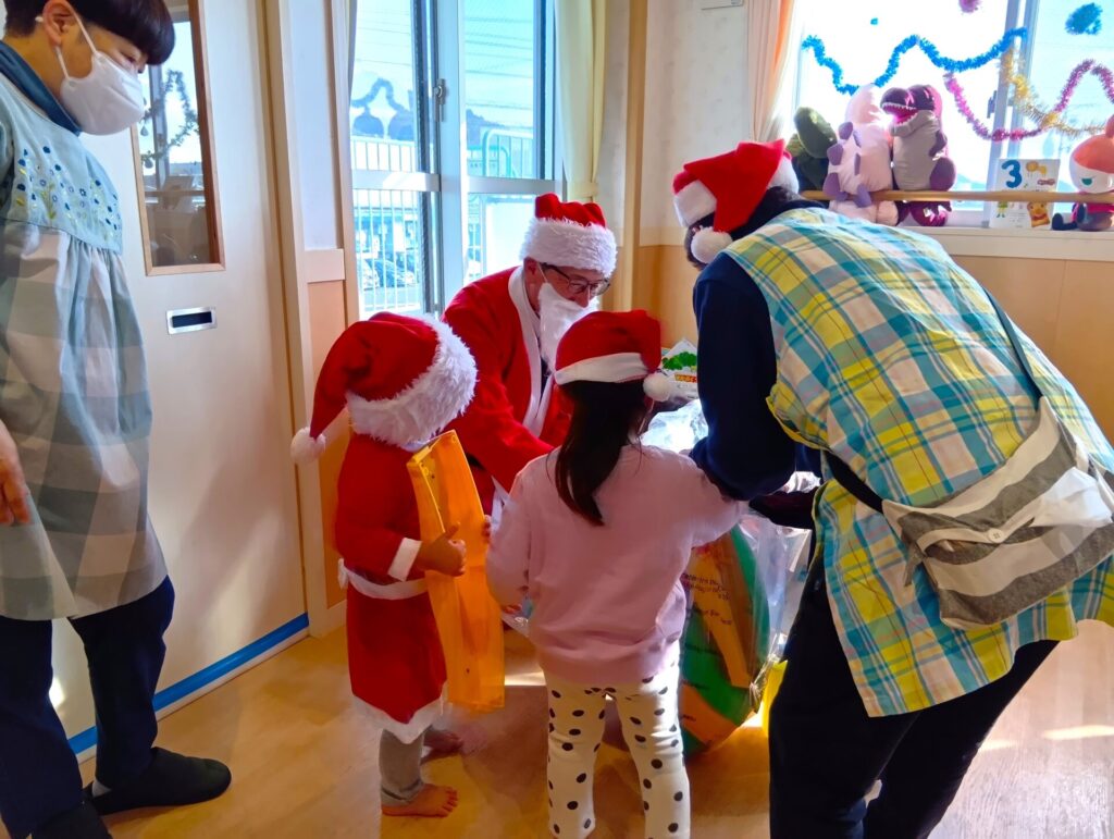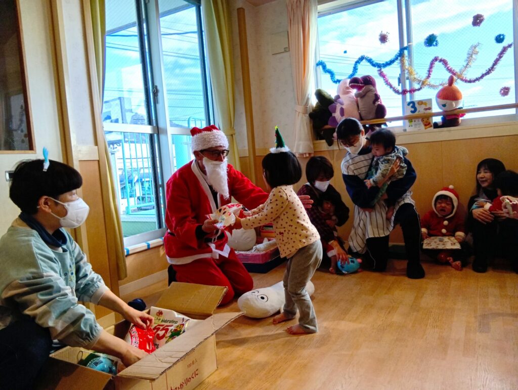 松葉倉庫㈱本社に併設した企業主導型保育園『まつの実』のクリスマス会が開催されました。社長と事務員さんが扮したサンタクロースとトナカイが、子供たち一人一人にプレゼントを届けました。泣き出す子供もいましたが、元気にプレゼントを受け取り、そっそく遊び始めていました。私たちにとっては、子供たちの元気が何よりのプレゼントです。